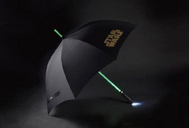 Beast Kingdom(野兽王国)的玩具厂商突发奇想,别出心裁的将激光剑与雨伞完美融合,将普通长柄伞的伞柄,替换成为内置LED灯、100%采用仿原著设计的激光剑伞伞柄,推出名为Lightsaber Umbrella的光剑雨伞。提供蓝、红、绿三款配色光剑雨伞,对应电影角色分别为应天行者、黑武士达斯维达及尤达大师。整个伞重2.5斤,伞柄长114厘米,由于LED灯的高亮特性,其还夜间安全警示灯的效用,夜间用户在路边行走时,可对司机起到警示的作用,提升用户安全性。「星球大战 帝国暴风兵摩托」
